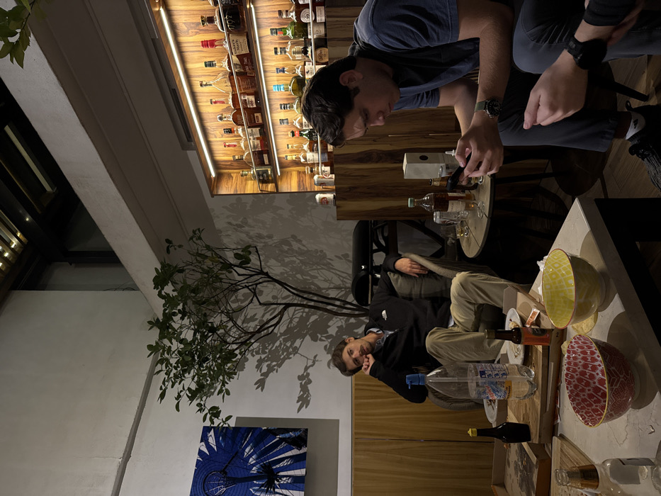 The image depicts an indoor recreational or living space in Interlomas, Mexico, illuminated by artificial lighting. Three individuals are present. On the left, a male with light-brown hair, wearing a dark zip-up jacket over a light shirt and khaki pants, is seated in a gray armchair, resting his chin on his right hand. To his right, a second male with dark hair, wearing a dark blue t-shirt and dark pants, is seated on a low stool, actively viewing a smartphone held in both hands. A watch is visible on his left wrist. The lower right foreground shows the forearm and hand of a third person, also wearing a black watch. A large rectangular coffee table in the foreground holds two patterned ceramic bowls (one red, one yellow) containing snacks, a large clear plastic water bottle with a blue pump dispenser, a brown bottle, a red-orange bottle, and open pizza boxes with remnants. A smaller, dark circular table near the center-right holds several glasses, two amber liquor bottles, and a white rectangular box. The right wall features a wooden bar cabinet with three illuminated shelves displaying numerous glass liquor bottles. Below these shelves are several beverage cans. On the left wall, a blue and white abstract art piece with a radial pattern is mounted. A medium-sized potted tree with green leaves stands between the art and the bar, casting shadows on the light-colored wall. A black barbecue grill is partially visible behind the armchair on the left. The walls are light-colored with lower wooden paneling, and the ceiling shows an exposed structure.
