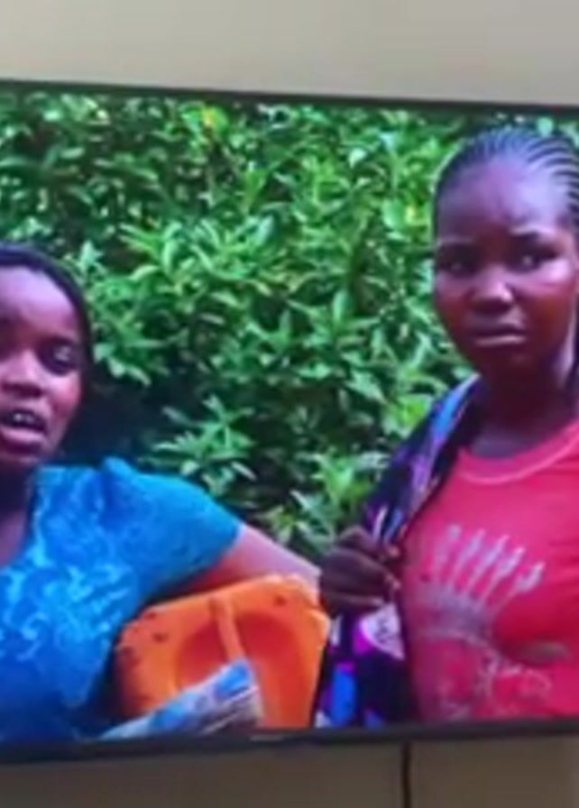 A TV mounted on a wall is displaying two young women. The woman on the left is wearing a blue lace top and leaning on a orange water jug. The woman on the right is wearing a pink T-shirt with a white handprint. She has a scarf draped over her shoulder and her hand on her hip. They are both looking at each other. The background is a lush green forest.