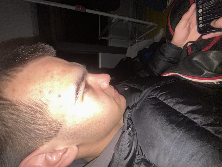 A side-profile shot captures a fair-skinned young man with short, light-brown hair. His blue eye is partially visible. He's wearing a dark puffer jacket, and another individual in a similar jacket is nearby, holding a phone. The background is dark, with a glimpse of pipes and structural elements suggesting an indoor setting. Overall the lighting is dim and somewhat harsh.