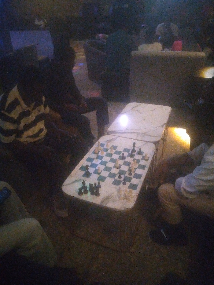 The image depicts a dimly lit indoor social setting, likely a lounge or common area, situated in Jos, Nigeria. In the central foreground, two individuals are seated at a small, rectangular table with a white, marble-patterned surface. A chessboard with blue and white squares is positioned on this table, displaying numerous black and white chess pieces mid-game. The individual on the left is wearing a horizontal striped polo shirt. The person on the right is partially visible, wearing light-colored trousers. Both individuals' faces are obscured by shadow. In the background, additional indistinct figures are seated on upholstered furniture, suggesting other patrons. The environment is characterized by low lighting, resulting in a grainy image quality, with bright reflections visible on the table surface.