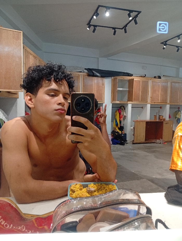A shirtless man with curly hair takes a selfie in a mirror. He holds a phone with a large camera lens. He is in a room with wooden cabinets and fluorescent lighting. There's food in a plastic container and a clear makeup bag with contents on a white counter. A person making a peace sign is reflected in the mirror, along with other blurry figures and clothing.