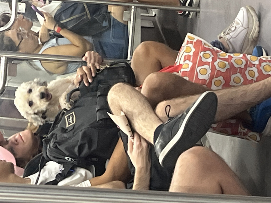 A crowded subway scene with numerous individuals. A white poodle rests on a black backpack beside a sleeping person with a pink hat. Another person is focused on their phone above. A person wearing egg patterned shorts has their legs crossed, and a black shoe rests atop their knee. A white sneaker is visible near the egg patterned shorts. The scene is chaotic and captures a moment of urban transit.