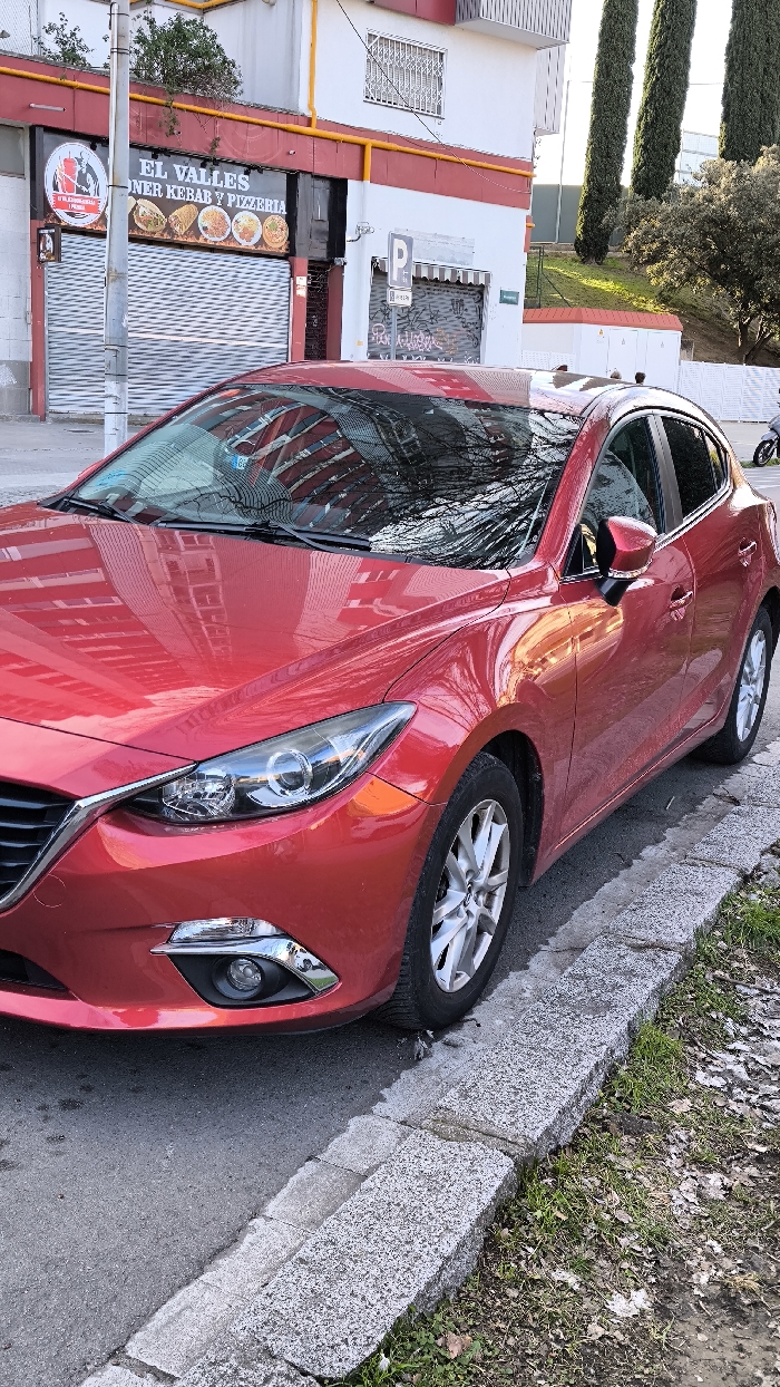 - "A red Mazda 3 hatchback is parked parallel to a concrete curb on an asphalt street in Cerdanyola del Vallès, Spain, under bright daylight" by FM-WId4x1, licensed under CC BY 4.0