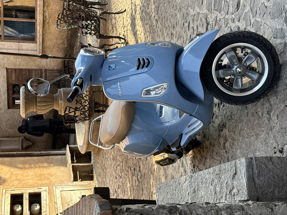 - "A light blue Vespa scooter is parked on a cobblestone street next to a stone curb" by FM-mkaXg2, licensed under CC BY 4.0