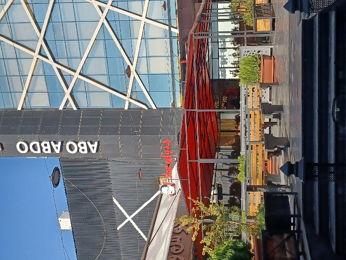 A striking architectural photo shows a modern building with crisscrossing beams against blue glass. At its base, “ABO ABDO” is prominently displayed. An adjacent structure features a red awning and the iconic KFC logo. Tables and chairs suggest an outdoor dining area, with greenery adding life to the scene. Steps lead up, contrasting the building's angular lines. The composition captures a blend of urban design and commercial elements.