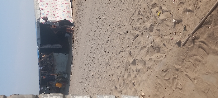 The image depicts an outdoor scene in Khan Yunis, Palestinian Territory, characterized by sandy terrain and a makeshift structure under a clear, light blue sky