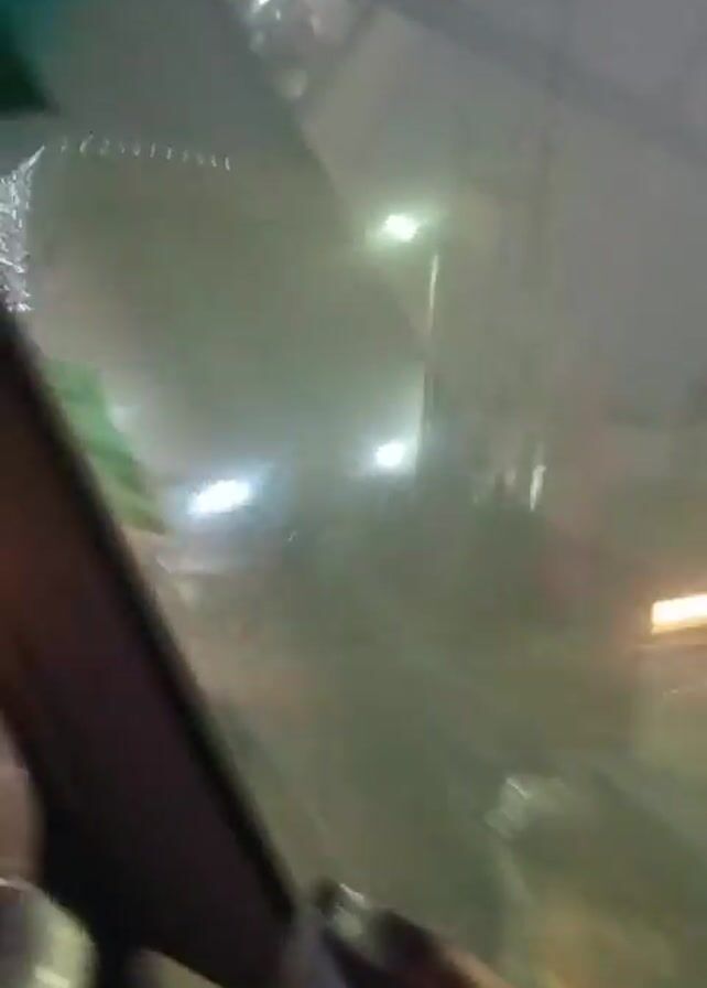 The video, shot from inside a vehicle at night, shows a driver navigating through a misty urban environment