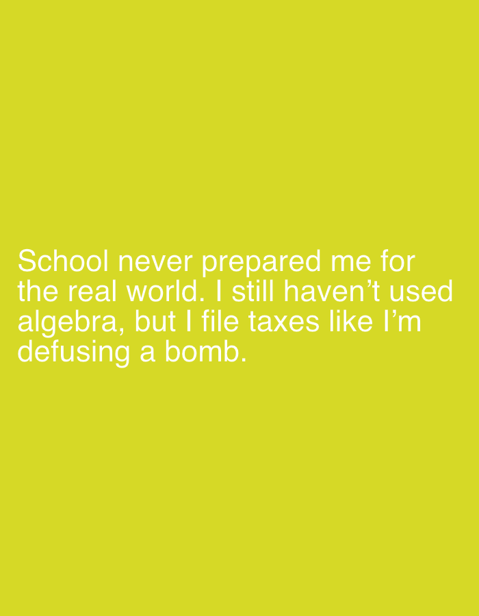 This image depicts a digital textual display, located in Umunekwu, Nigeria. The scene consists of a solid, bright lime-yellow background. Superimposed centrally on this background is white, sans-serif text presented in four lines. The text reads: "School never prepared me for the real world. I still haven't used algebra, but I file taxes like I'm defusing a bomb." No individuals, actions, or other objects are present within the frame. The environment is entirely abstract, defined solely by the background color and the overlaid text.