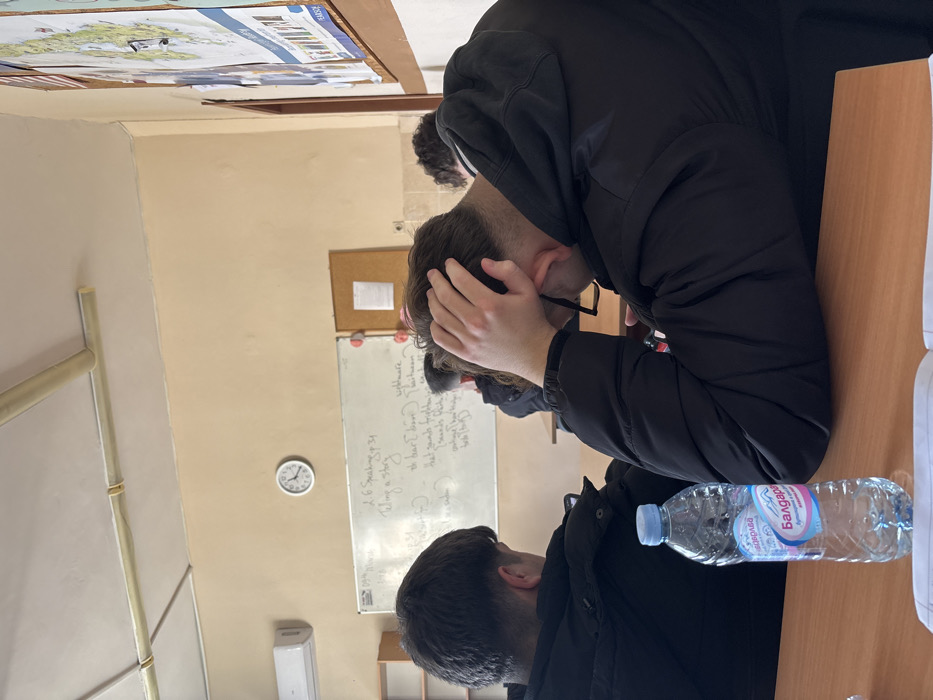 The scene depicts the interior of a classroom, likely located within a school in Kardzhali, Bulgaria. In the foreground, a male student is seated at a light-colored wooden desk, his back partially towards the camera. He wears a black puffer jacket. His right hand is positioned on the back of his head, fingers interlocked with his hair, and black-framed glasses hang from his right ear. To his left, another male student is seated, also wearing a black puffer jacket and facing away from the camera. A mobile phone or small electronic device is visible on his desk. On the foreground desk, a translucent plastic bottle of "Балдарана" (Baldarana) mineral water with a blue cap and a white/pink label stands upright. The classroom features beige-colored walls and a suspended ceiling with visible conduit. On the front wall, a large white magnetic whiteboard displays handwritten English text, including "2.6 Speaking. P.31," "Telling a story," "nightmare," and "heart." Above the whiteboard, a white analog clock indicates approximately 10:45. To the right of the whiteboard, a light brown corkboard is mounted. A white wall-mounted air conditioning unit is visible on the left wall, above a partial view of wooden shelving. On the far right wall, a world map or a map of Europe and other educational posters are affixed. The room is well-lit, with light sources external to the frame. Several other students are partially visible in the mid-ground, seated at similar desks, generally facing the whiteboard.