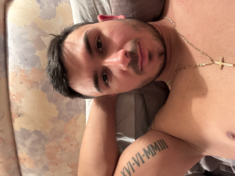 The scene depicts a male individual in an indoor setting within the city of Fowlis Easter, United Kingdom. The subject, a man in his mid-20s to early 30s, has short, dark hair, a trimmed beard and mustache, and dark eyes. He is bare-chested and lies in a supine position, with his upper torso visible. His right arm is bent, appearing to be positioned behind his head or neck, which accentuates his bicep. On his right upper arm, a vertical tattoo displays the Roman numerals "XVI-VI-MMIII". Around his neck, he wears a gold-colored chain necklace with a plain gold cross pendant. He gazes directly towards the viewer with a neutral expression. The background features an upholstered surface, consistent with a headboard, displaying a floral pattern in muted tones of beige, light pink, light purple, and grey. A grey pillow is partially visible behind his head.