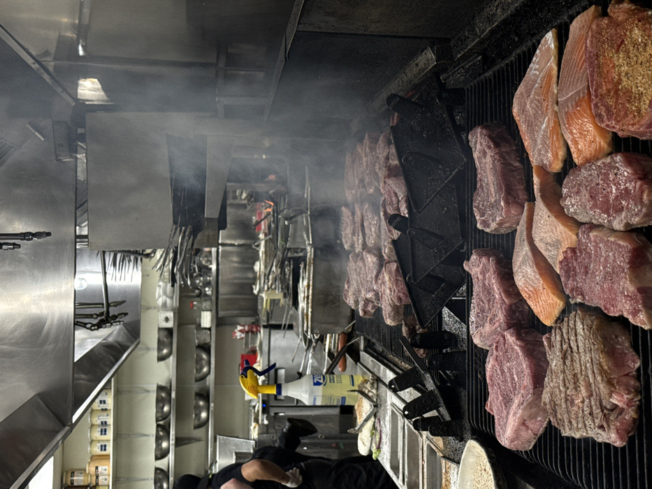 In a commercial kitchen, a grill sizzles with steaks and salmon