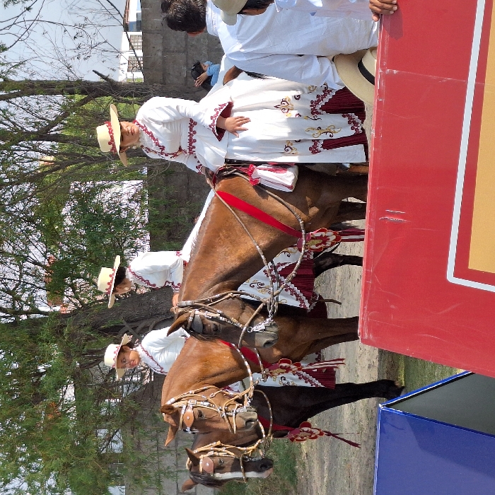 - "A row of women wearing matching white dresses with red trim and wide-brimmed hats sit atop horses" by FM-b0Aw43, licensed under CC BY 4.0