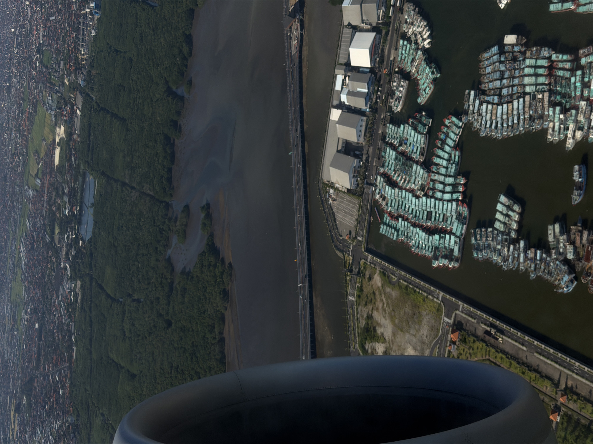n aerial view, likely taken from an airplane window, of a portion of Denpasar, Indonesia. In the foreground, the rounded edge of what appears to be a jet engine cowling is visible. Moving from left to right, the image reveals a dense urban area, transitioning into a lush, green forest. A waterway, likely a river or a large estuary, flows through the scene, spanned by a bridge carrying vehicular traffic. On the right side of the waterway is a built-up area dominated by a large number of boats docked in a harbor or canal. The boats are densely packed together, suggesting a fishing port or a commercial docking area. Adjacent to the waterway are several large, white buildings, possibly warehouses or industrial facilities. A road and parking area separate the buildings from the docks. A stretch of what appears to be recently disturbed land extends from the developed area, showing some early signs of vegetation growth.
