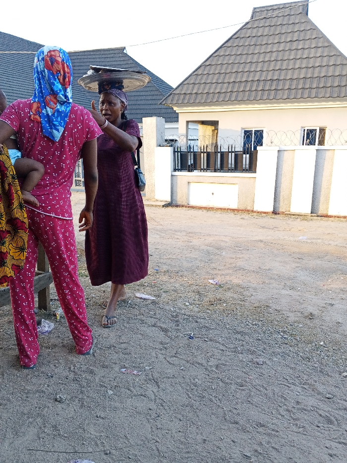 The image depicts an outdoor scene in Adonkolo, Nigeria, featuring two adult females and an infant on an unpaved dirt path. In the foreground, slightly to the left, an adult female is observed from behind, wearing a pink two-piece pajama set with white polka dots and a blue headscarf patterned with orange flowers. She holds an infant, partially obscured by patterned yellow and red fabric, on her left hip. Her footwear is dark. Adjacent to her, an adult female stands facing the first woman, wearing a dark purple knee-length dress and a matching headwrap. She carries a large, dark, shallow tray containing indistinct items balanced on her head. A small black shoulder bag hangs from her left side. Her right arm is raised, with her hand gesturing towards the first woman, and her mouth is open, suggesting speech. She is barefoot, with a single grey flip-flop visible on the ground near her right foot. The ground consists of packed dirt with some gravel and scattered small pieces of debris. In the background, two modern residential buildings are visible, each featuring a grey tiled pitched roof. The prominent building on the right is light-colored with a textured lower facade, a fence composed of grey pillars and black horizontal bars, and barbed wire along its top. Two white-framed windows with security bars are present. The sky above is clear.