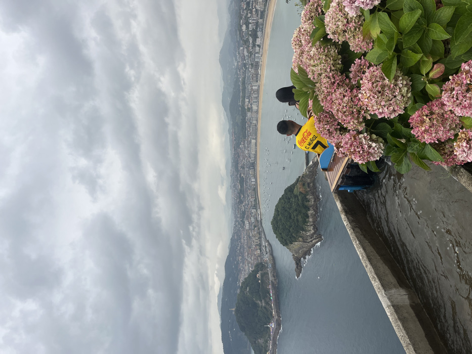 The image captures a panoramic view of San Sebastián, Spain, specifically overlooking La Concha Bay from Monte Igueldo. The sky is overcast with dense grey clouds. In the immediate foreground, a concrete channel containing flowing water, likely part of a flume ride, runs along the left side. Adjacent to this channel, a section of a wooden amusement park ride cart with blue seats is visible. A large bush with clusters of pink and white hydrangeas occupies the right foreground. Two individuals are seated in the ride cart or on a bench, observed from behind, facing the bay. The person on the left wears a yellow shirt with "Coca-Cola" and "C. MUÑOZ 7" printed on the back. The person on the right is dressed in dark clothing and holds a mobile phone in their right hand, directed towards the scenic vista. The midground features La Concha Bay, populated by numerous small boats and yachts at anchor. Santa Clara Island, a prominent, tree-covered landmass, is situated in the bay. Beyond the bay, the dense urban landscape of San Sebastián extends along the coastline, backed by green, undulating hills and mountains that fade into the cloudy horizon. Monte Ulia is visible to the far left, with a distinct structure on its peak.