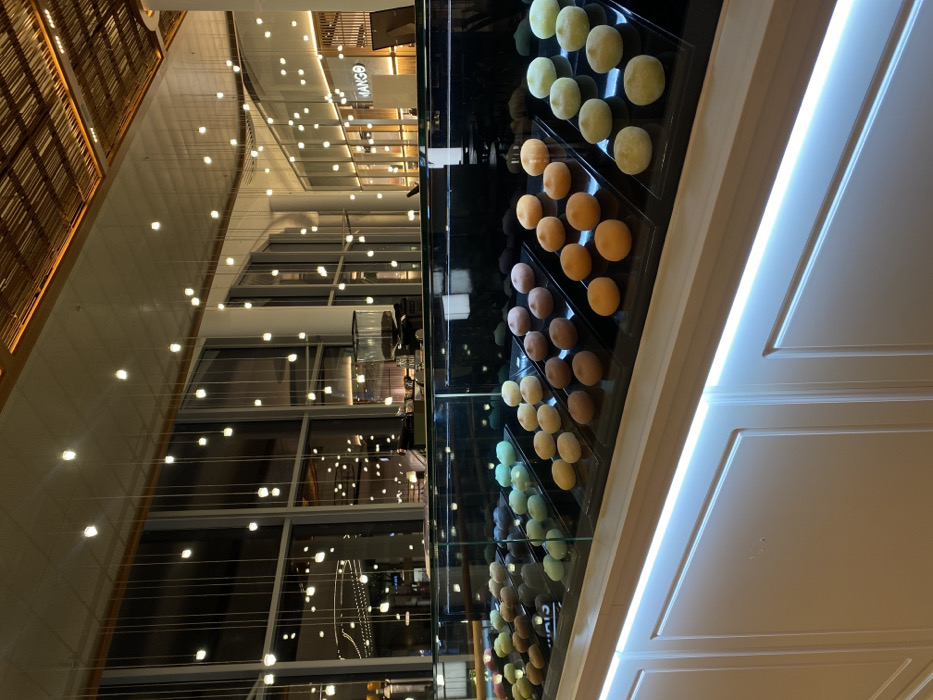 The image captures an interior scene of a commercial establishment, likely a café or dessert shop, within a large, modern shopping complex located in Saint-Laurent-du-Var, France, specifically consistent with a mall such as Cap3000. In the foreground, a white-paneled counter is illuminated by a horizontal LED strip along its top edge. Above this counter, a glass display case presents numerous spherical mochi-like desserts, arranged on black rectangular trays in distinct color groupings, including shades of green, cream, light brown, orange, and pale yellow. Approximately 8-12 pieces are visible per tray, with at least seven trays displayed. Behind the display case, a counter hosts a transparent coffee grinder filled with dark coffee beans. The background features a vast interior space, viewed through extensive, multi-paned windows. This area is characterized by a high ceiling from which numerous small, bare bulb lights are suspended at varying lengths by thin cables. A section of the ceiling exhibits a distinctive woven or textured panel, possibly bamboo. In the distant background, an illuminated "MANGO" retail store sign is clearly visible. No individuals are depicted or identifiable within the frame.