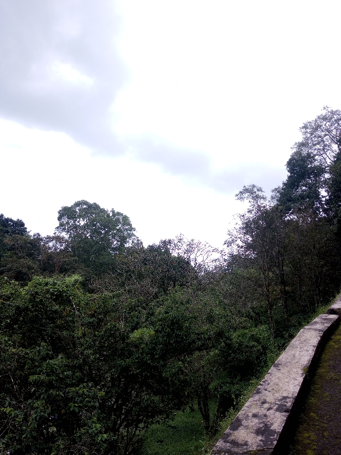 The image displays an elevated view of a dense, multi-layered forest under an overcast sky in Kanand, India. Dark green tree canopies, exhibiting varied textures and shades of foliage, extend from the foreground to the distant horizon. The upper third of the frame consists of a light gray, cloudy sky. A weathered concrete barrier or retaining wall, stained with dark blotches and apparent organic growth, is visible in the lower right quadrant, running diagonally upwards towards the mid-right edge. No individuals, man-made structures beyond the concrete barrier, or discernible actions are present within the scene.