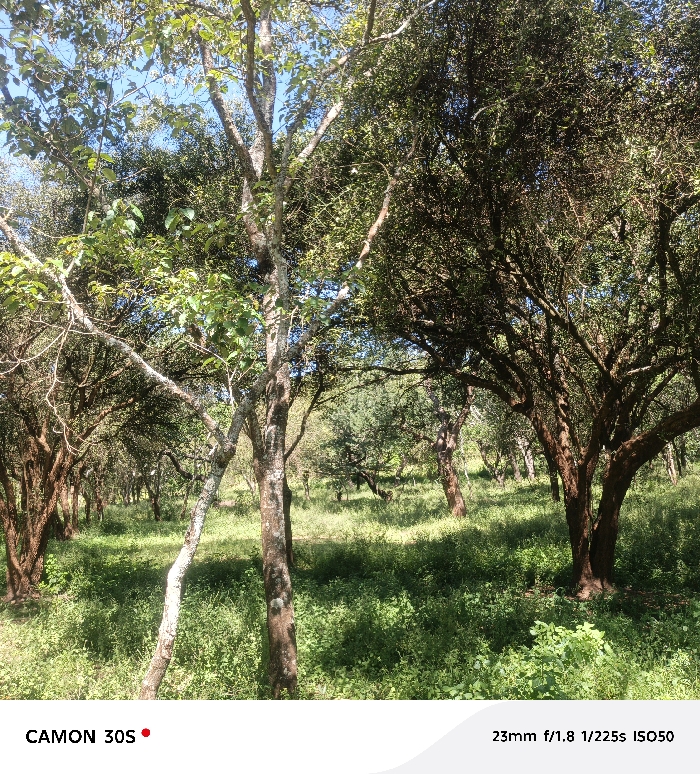The image displays a verdant, sunlit woodland or densely treed area located in Kola ward, Kenya