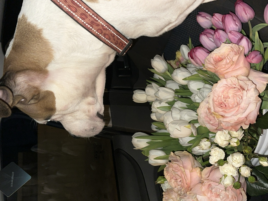 The image depicts a dog inside a vehicle in Базарово, Russia. The dog, primarily white with tan-brown markings on its head and neck, is visible from the upper right, facing leftward and slightly downward. It wears a brown patterned collar with reflective dots. In the foreground and center, a large floral arrangement occupies space within the vehicle. This arrangement consists of a prominent cluster of white tulips with green stems, several large light pink or peach colored roses, smaller white spray roses, and a collection of closed purple-pink tulips visible on the right side of the arrangement. The background shows the dark interior of the vehicle, including a window reflection and a black "OCEAN BREEZE" branded air freshener hanging in the upper left. No people are visible.