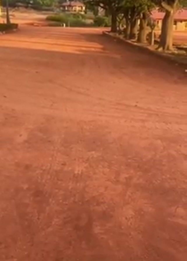 The video depicts a red dirt road lined with trees. Several buildings are visible in the background. The sky is cloudy. The camera slowly pans from left to right.