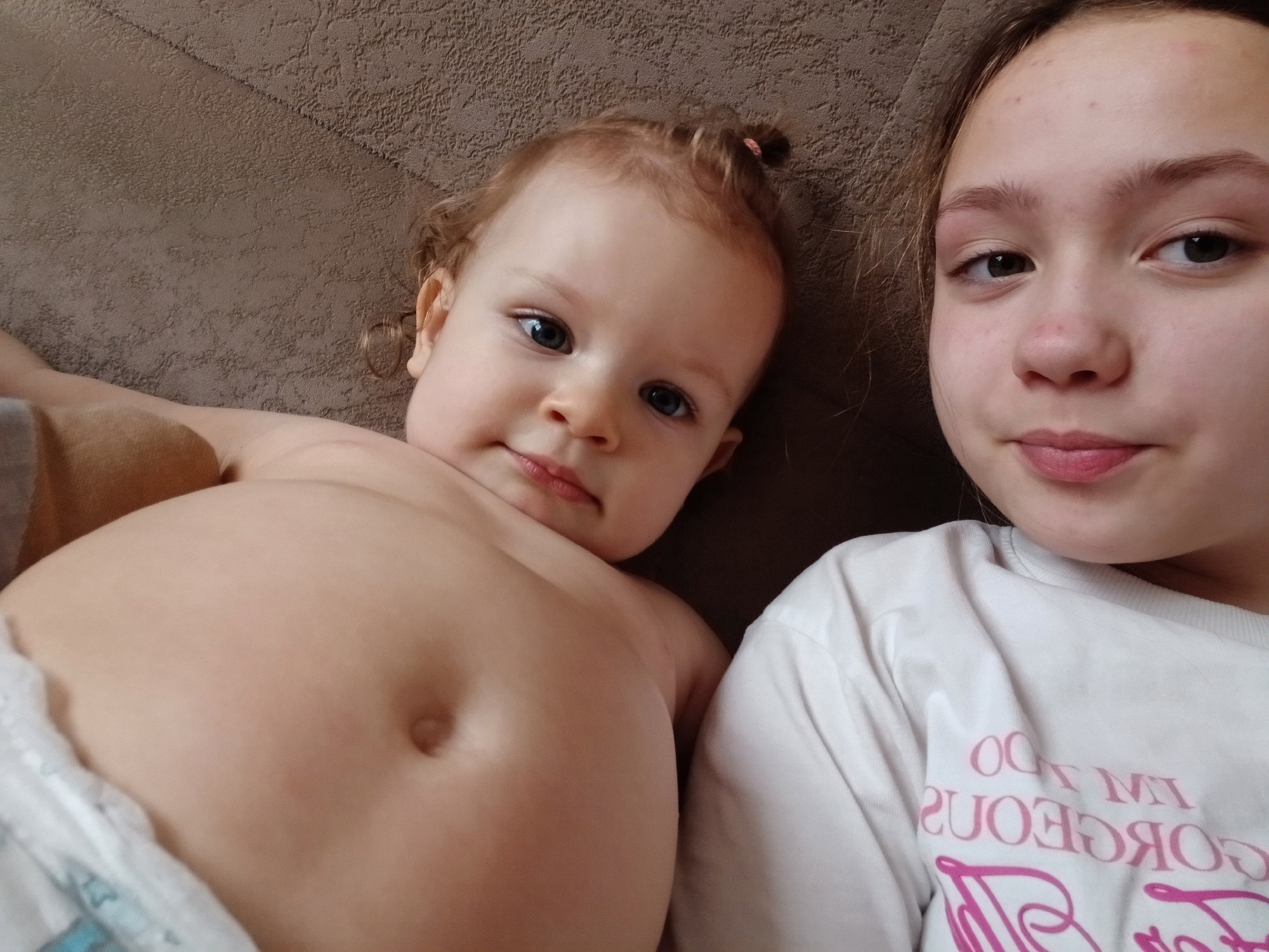 Two individuals are in the scene. A toddler with fair skin, light red curly hair pulled back in a small bun, blue eyes, and a slightly smug expression is positioned on the left side of the image. The toddler's torso is bare except for a diaper. On the right side of the image, there is an older child or adolescent with fair skin, light brown hair, and brown eyes. They are wearing a white T-shirt with pink lettering. The clothing item is inscribed with the words "I'M DO GORGEOUS" in bold pink letters. The background appears to be a brown textured surface, possibly a couch or bed. The city of Krasnodar, Russia cannot be determined based on the provided image.