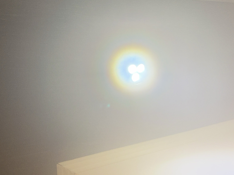 white ceiling with a three-bulb light fixture near the center. The light source is bright and creates a halo effect on the surrounding ceiling. A corner of a wall or cabinet is visible in the lower right corner, also painted white. The lighting casts a soft, diffused glow throughout the space.