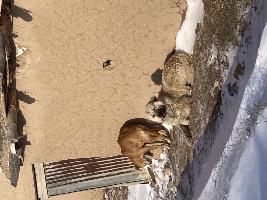 The scene in Kan Mehtarzai, Pakistan, depicts an outdoor area on a clear, sunny day with visible snow cover. A prominent, light-brown mud-brick wall forms the background, showing cracks and a small, irregular dark opening approximately centered horizontally. At the top of the wall, a weathered wooden beam structure is present, casting shadows. To the left, a vertical, corrugated metal door or shutter, displaying rust, is partially obscured by the wall. Two dogs are on the uneven ground, which consists of patches of dirt and snow. In the foreground-right, a large, light-colored dog with shaggy fur lies on its side, facing slightly left, with its head raised. To its left and further back, a smaller, reddish-brown dog stands facing the corrugated metal door, with its head lowered towards the ground. The reddish-brown dog is primarily in shadow, while the light-colored dog is partially illuminated by direct sunlight. Sparse, tangled wire is visible in the snow in the lower-left foreground. Distinct shadows indicate strong overhead or side sunlight.