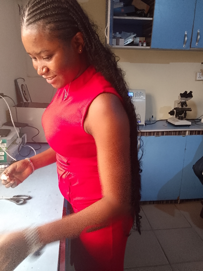 A female individual is depicted in a medical or laboratory setting. She is a woman with dark skin and long, dark braided hair, styled over her left shoulder and extending down her back. She is wearing a sleeveless, red, high-neck top. A silver-colored necklace with a pendant is visible around her neck, and a silver-colored bracelet adorns her left wrist. Her face is turned slightly to her left, with a gentle smile directed downwards. Her left hand is positioned over a light blue countertop, holding a small white object, possibly cotton. A pair of silver scissors lies on the counter nearby. The right arm is blurred, indicating motion. The background features a light beige wall with blue cabinets mounted above a continuation of the light blue countertop. The cabinets contain various items including packaged materials and small containers. On the countertop in the background, a white medical analyzer with a blue digital display and buttons is present, alongside a black and white binocular microscope. Small bottles and an electrical socket are also visible. The floor is covered with light-colored tiles. The specific location within Lagos, Nigeria, is not ascertainable from the visual evidence provided.