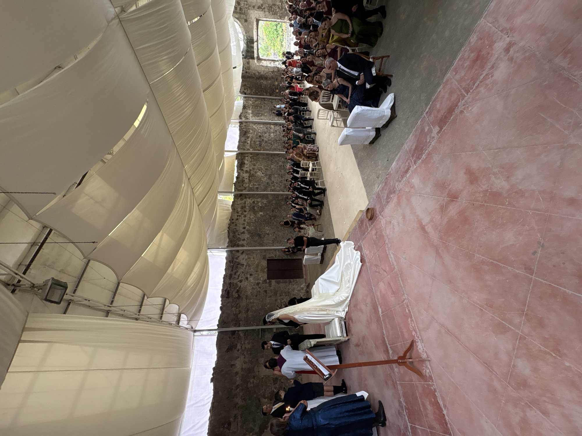 wedding ceremony taking place indoors, presumably in a historic building or event space in Progreso, Mexico. Rows of seated guests line the sides of the room. A bride and groom are kneeling near the front, facing a clergy member and other figures. The room is covered with a white canopy. The floor is made of red stone tiles. The walls are stone.