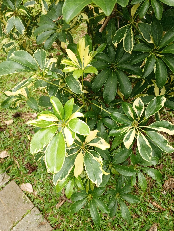 - "A vibrant cluster of variegated Schefflera arboricola, commonly known as dwarf umbrella trees, dominates the scene" by FM-YuqmA3, licensed under CC BY 4.0