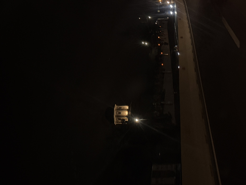 A nighttime scene in Jilava, Romania, captures a distinct, brightly illuminated octagonal building with a dome-like roof, identified as the Jilava Prison water tower, elevated against a dark sky. The structure is bathed in warm yellow light. In the immediate foreground, a dark asphalt road surface features a solid white lane marking on its right edge. A light-colored concrete barrier runs parallel to the road on the left. Multiple artificial light sources are present across the midground, including a glaring white streetlight positioned slightly below the illuminated building, other scattered amber and white lights, and headlights from several vehicles on a road further to the right. The overall environment is dark, with no visible human activity or interactions.