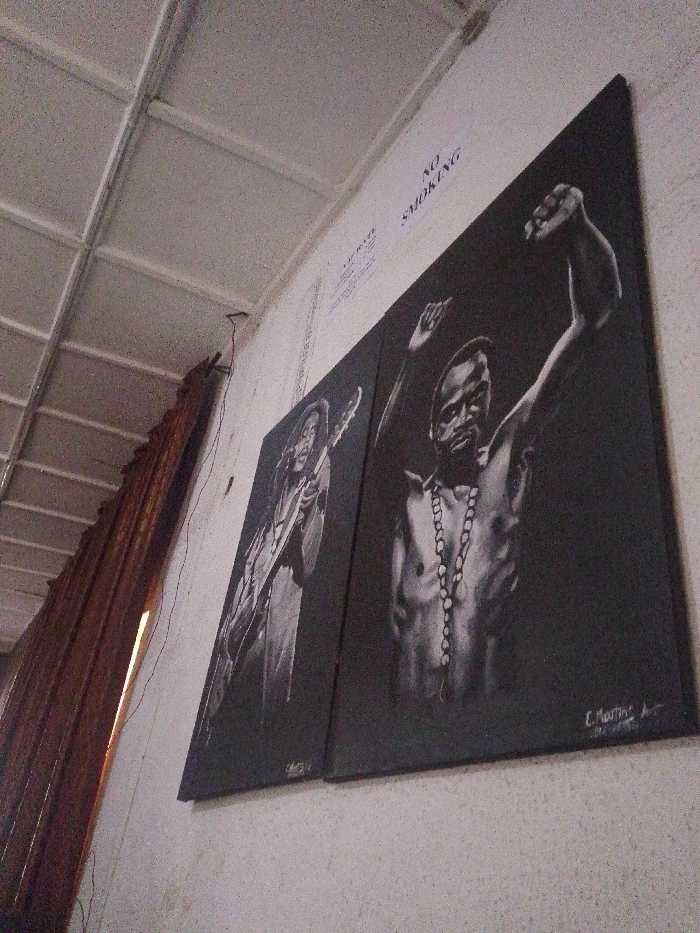 The image displays an interior wall in the city of Unknown, Unknown, featuring two large, monochrome artworks. The artwork on the left depicts Bob Marley playing a guitar. The artwork on the right portrays Fela Kuti, shirtless, with both arms raised and wearing a long, light-colored beaded necklace; a signature "C. Martins Art" is visible in the bottom right corner. Above the artworks, an angled "NO SMOKING" sign is affixed to the off-white, textured wall, with additional partially visible text, including "OPERATE". Electrical wiring runs vertically down the wall to the left, adjacent to a dark brown wooden architectural column or panel. A narrow, vertical streak of bright light is visible in the gap between this wooden structure and the wall. The ceiling in the upper left quadrant is white with a discernible grid-like pattern.