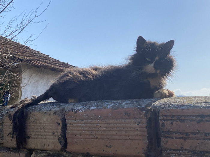 - "The image depicts a scruffy, long-haired cat lying on a weathered brick wall in Dobri dial, Bulgaria" by FM-PFEbq2, licensed under CC BY 4.0
