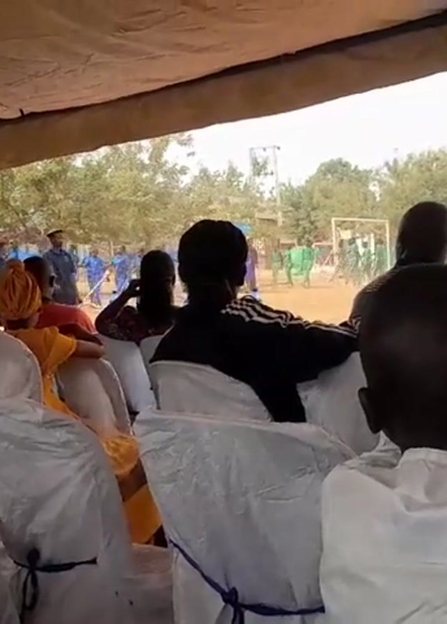 A crowd of people sit in white, plastic chairs under a tent watching a marching band perform on a field. The field is surrounded by trees and buildings. Some people in the crowd are wearing traditional African clothing, while others are wearing more casual attire. The marching band members are wearing blue uniforms. They play instruments including drums, trumpets and flutes.
