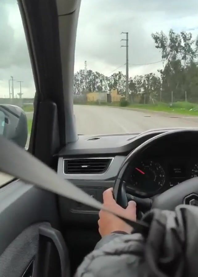 The camera, positioned from the driver's seat of a car, captures a first-person perspective of driving on a road