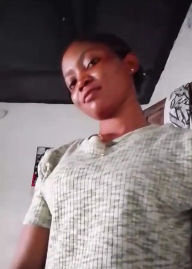 A woman is standing indoors, looking down at the camera