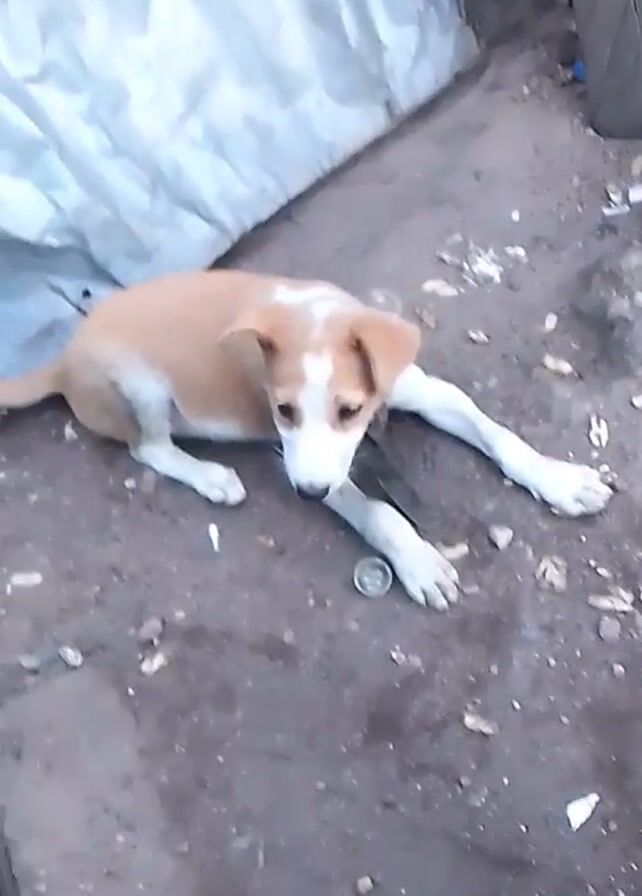 A light brown and white puppy is lying on a dirt surface. The puppy is facing the camera and panting. There is a piece of shiny metal sheeting and a dark wooden post or beam behind the puppy. There are various small pieces of white trash scattered around on the ground.