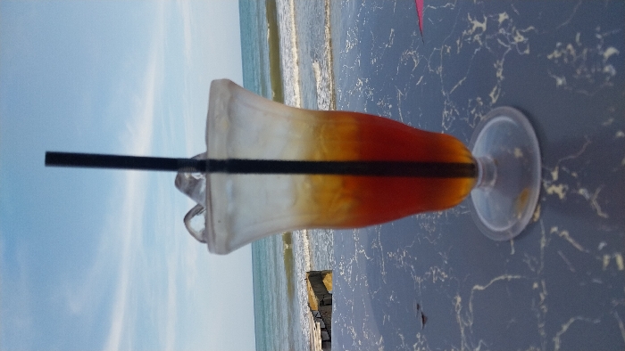 - "A tall, clear glass containing an iced, layered beverage with a black straw is positioned centrally on a dark, veined tabletop" by FM-t5Tl43, licensed under CC BY 4.0