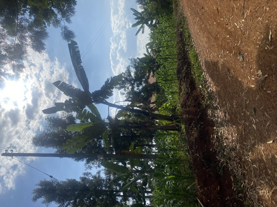 A vibrant, sunlit scene showcases a dirt road bordered by lush vegetation. Corn stalks and various plants thrive along the edge. Banana trees stand prominently, their broad leaves reaching towards a blue sky filled with puffy white clouds. An electric pole with wires cuts across the sky, adding a touch of civilization to the natural landscape. The sunlight reflects off the leaves and casts shadows along the path.