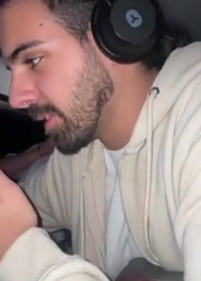 A person is indoors, wearing a light beige hoodie and black headphones with a silver or gray logo on the side. The person has dark hair pulled back, a beard, and is looking towards the left side of the frame. The person is talking and moving their hands while holding what appears to be a small electronic device. The background is dark and indistinct, but some lights and possibly another person are visible.