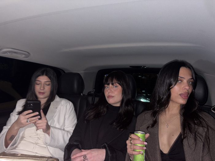 Three women are seated in the back of a car. The woman on the left is looking down at her phone. The woman in the middle is looking directly at the camera. The woman on the right is sticking her tongue out slightly and holding a green can. All three women have dark hair. The woman on the left is wearing a white blazer, the woman in the middle is wearing a black coat, and the woman on the right is wearing a brown coat. The interior of the car is dark and modern.