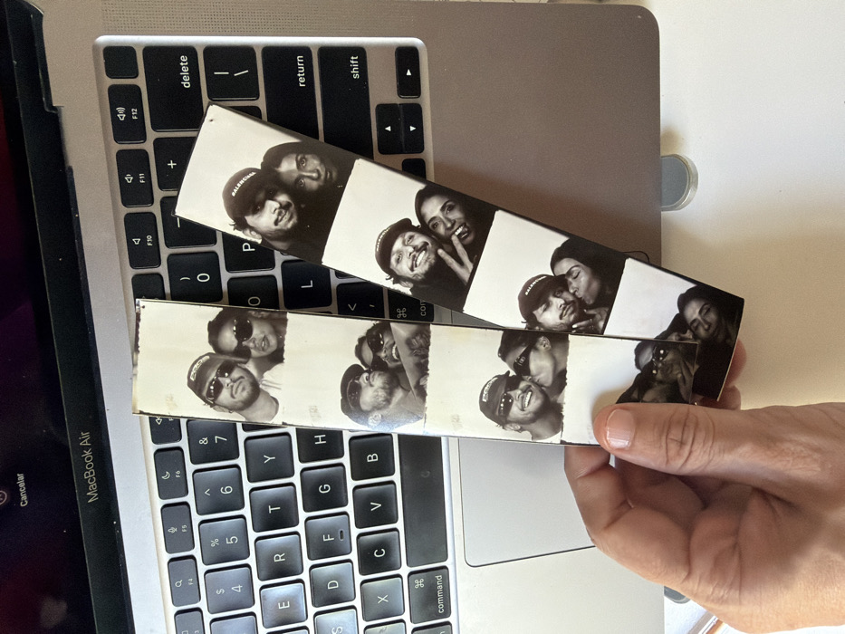 two black and white photo booth strips lying on a MacBook keyboard