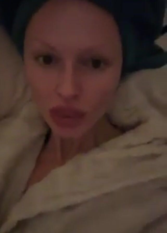 A fair-skinned woman is lying down, wearing a light colored robe and a dark blue towel wrapped around her head. She has light eyebrows and her lips are parted slightly. The camera is positioned above her, looking down. The scene appears to be indoors and the lighting is dim.