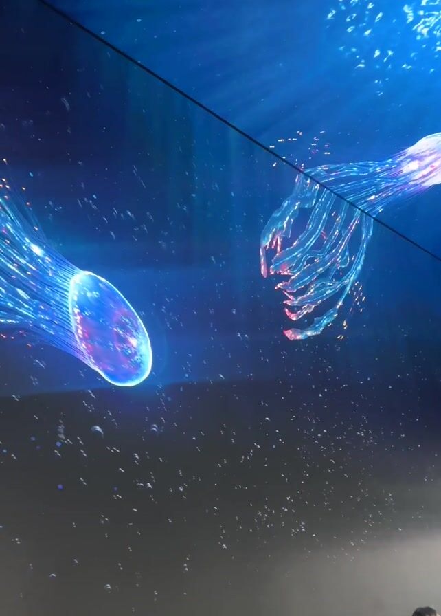 The camera angle points up into a room with a digital display. The ceiling and two visible walls show a blue underwater scene with glowing jellyfish, bubbles, and light patterns. Several people stand below, looking up and filming the display. One person wears a tan backpack. The lighting is mostly blue from the display.
