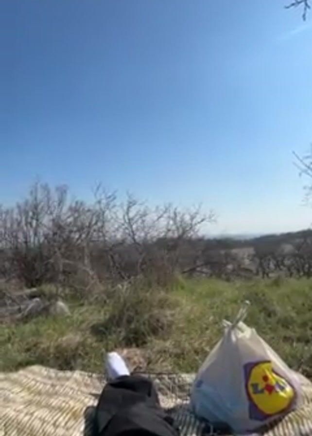 person lying on a blanket in a grassy field under a clear blue sky. The person is wearing black pants and white socks. Next to them is a plastic shopping bag with a Lidl logo. In the background, there are trees and a distant view of hills. The camera is static and the perspective is from the person lying on the blanket. The scene suggests a relaxed outdoor setting, possibly a picnic or rest.