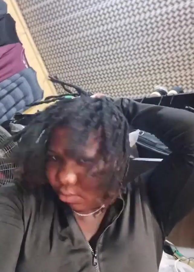 A medium shot video shows a dark-skinned person wearing a black long-sleeved zippered jacket. The person has short dreadlocks that partially obscure their face, especially at the beginning of the video. The person runs their hands through their hair, pushing it back from their face to reveal more of their features. A silver chain necklace is visible. The background shows what appears to be a cluttered room with various objects including clothing and a fan. The wall behind the person has a repeating geometric pattern.