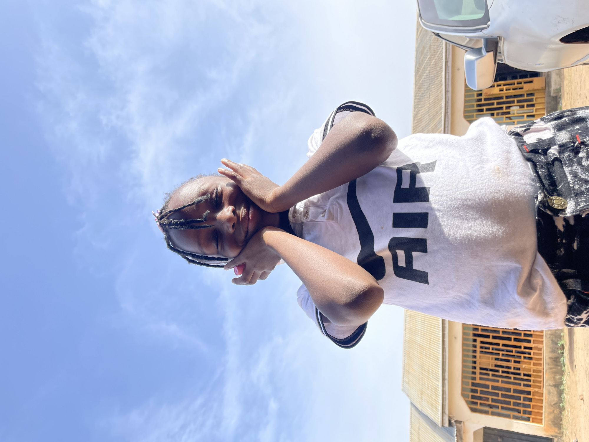 An individual is depicted from a low-angle perspective, centered against a bright blue sky with scattered cirrus clouds, in Barakin Akawo, Nigeria. The subject, a young person with dark skin and dark braided hair, is smiling with closed eyes, pressing both hands against their cheeks in a playful gesture. A small pink object is visible near the right temple. They are wearing a white collared t-shirt with black stripes on the sleeves and the word "AIR" printed in black on the chest, along with black and white patterned lower garments. In the background, to the left, is a single-story building with a light-colored corrugated metal roof and a prominent window covered by vertical wooden or metal slats. To the right, part of a silver vehicle, including its side mirror and front quarter panel, is visible. The ground is unpaved, appearing as dirt or sand. The scene is illuminated by strong, natural daylight.