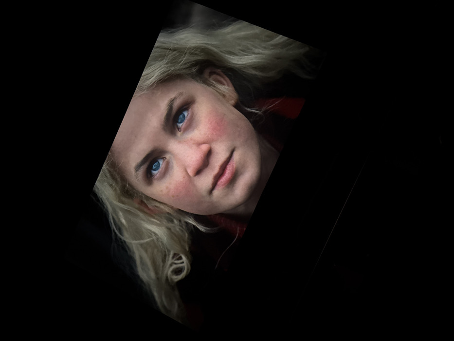 The image displays a head-and-shoulders portrait of a young individual, appearing to be female, with light blonde hair, fair skin, and prominent blue eyes
