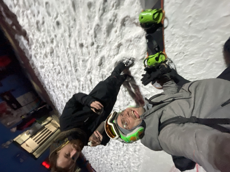 This nocturnal image, captured in Jahorina, Bosnia and Herzegovina, depicts two males standing on a snow-covered surface. The subject in the foreground, appearing to take a selfie, wears a grey winter jacket, a green and iridescent ski helmet with goggles pushed up, clear-framed glasses, and black gloves; he smiles broadly with his tongue slightly extended. A black snowboard with bright green bindings rests to his right on the snow. The second subject, positioned behind and to the left, wears a black winter jacket, dark pants, and a dark neck covering over visible dreadlocks or braids. He holds a silver-colored flask or bottle in his left hand and a dark cup in his right. The ground is covered in disturbed white snow. In the background, dimly lit structures indicative of a building are visible, featuring faint red and blue light sources and architectural elements.