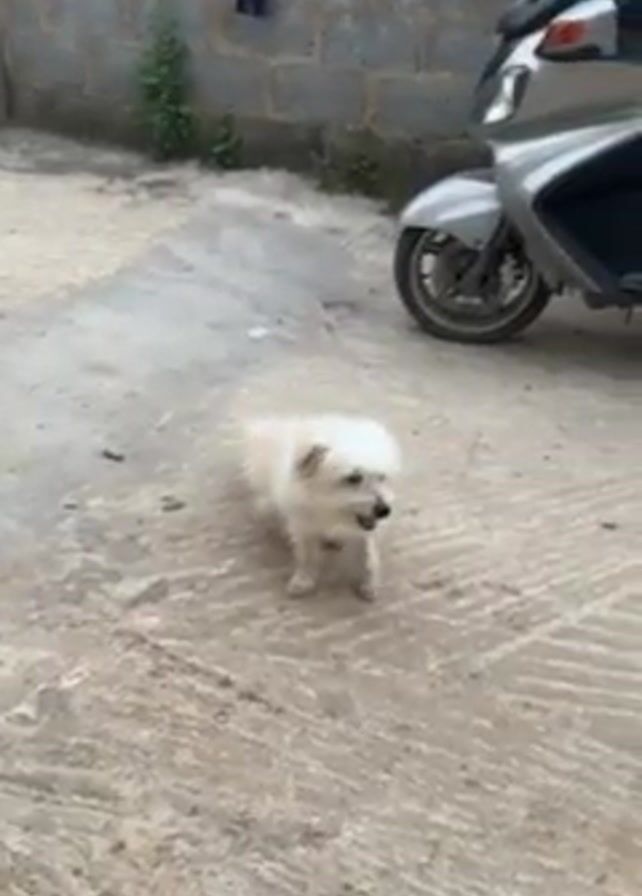 A small, white, long-haired dog is standing on a concrete surface. The dog then starts to walk across the surface, heading to the left. A motorcycle is visible in the background, parked next to a cinder block wall. Some clothing is hanging on the wall.